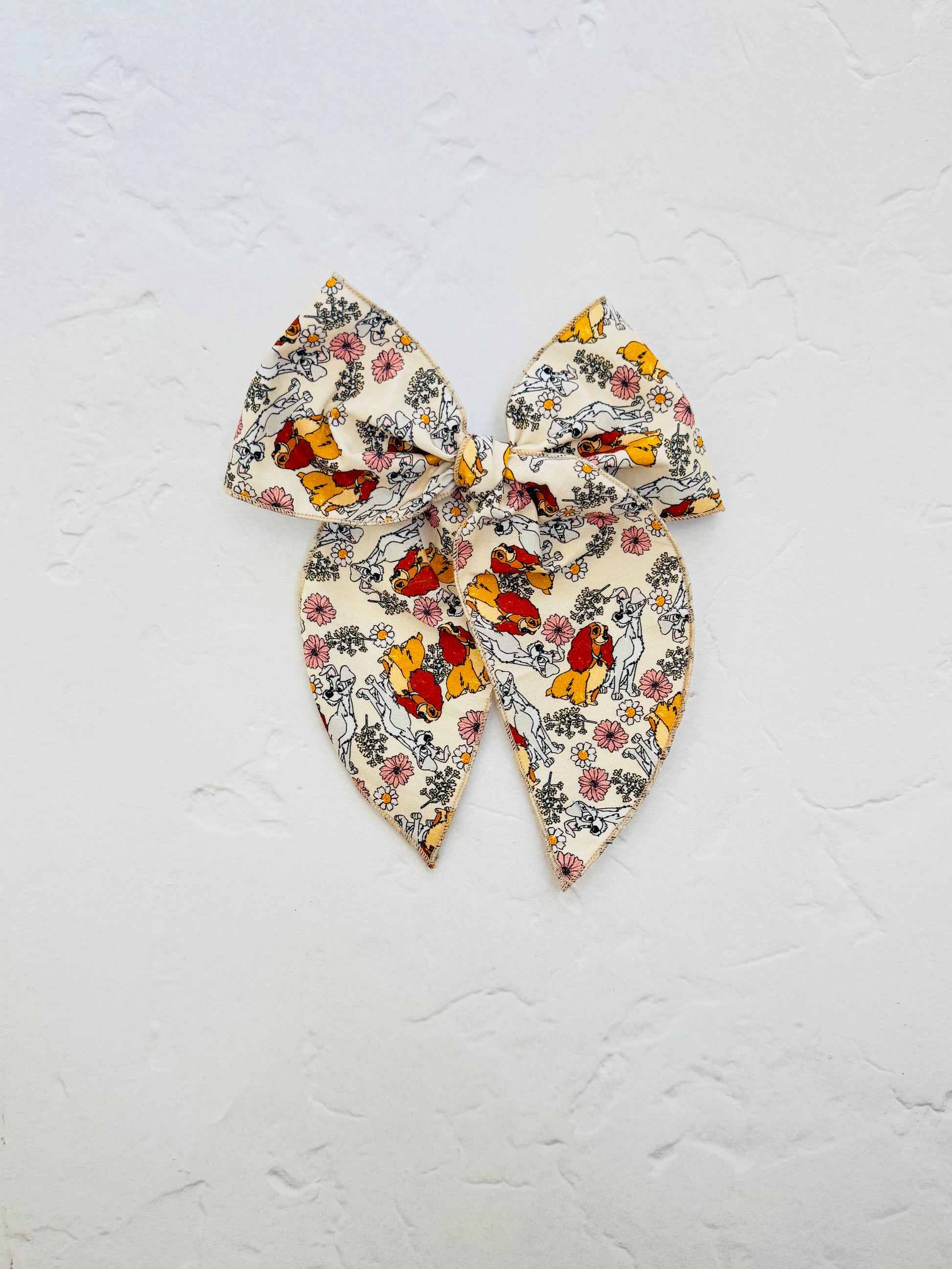 Midi-sized bow featuring an lady and the tramp print with beige serged edge and attached to alligator clip.