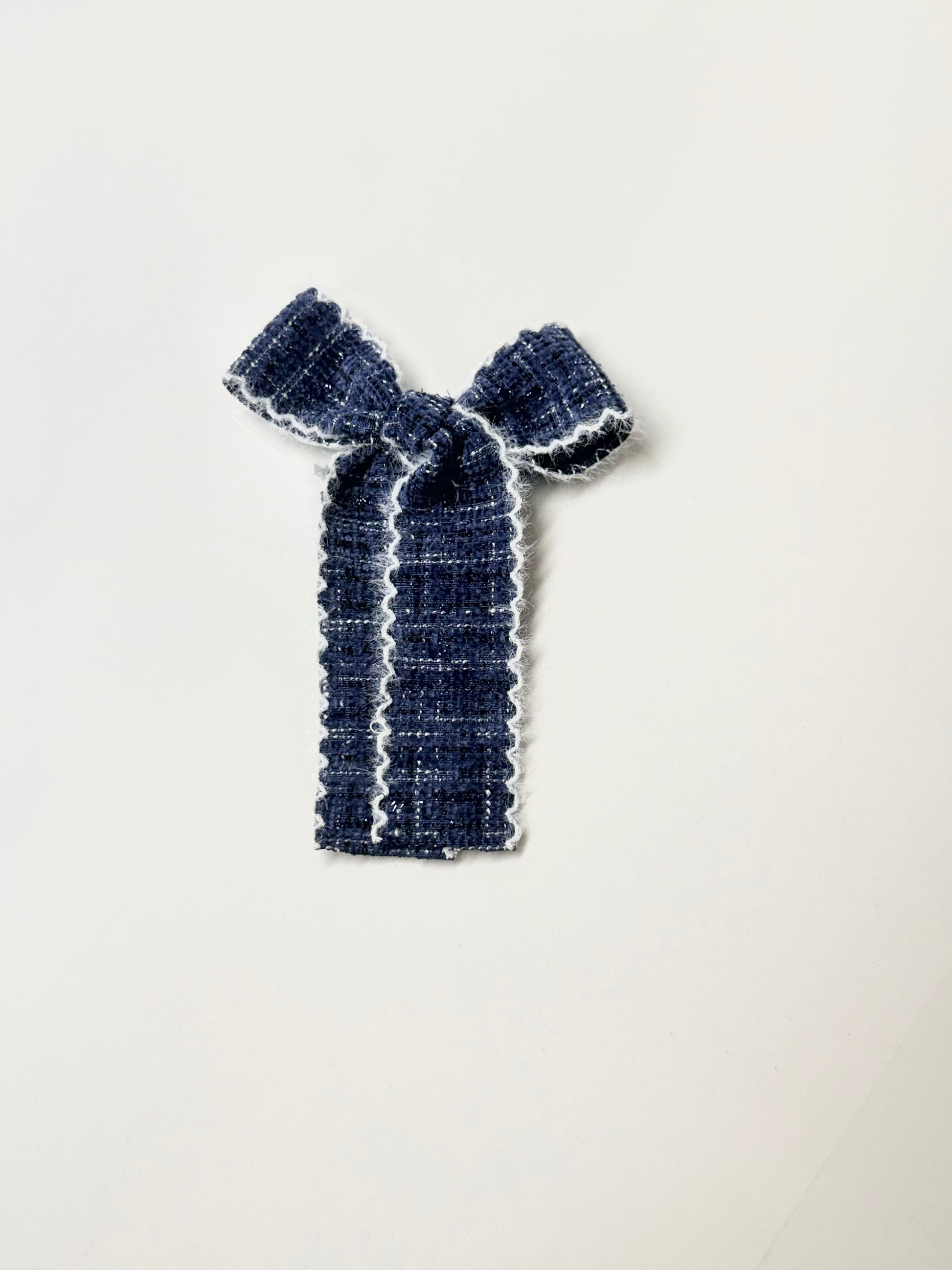 Meet the Midnight Frost Bow, a stunning navy textured bow with soft white fuzzy trim — the perfect mix of cozy, classic, and stylish. Handmade with a rich navy knit/tweed-style fabric, this bow adds a polished winter charm that’s beautiful for the holidays and wearable all year long.